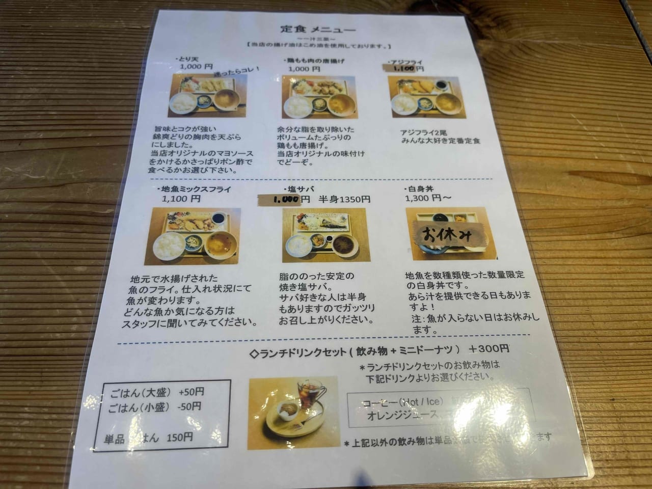 こちらが定食メニューです!目の前にある西浦漁港で水揚げされた地魚を使った定食や、市特産品で深海魚のメヒカリを使用したりと蒲郡ならではの食事がお楽しみいただけます。