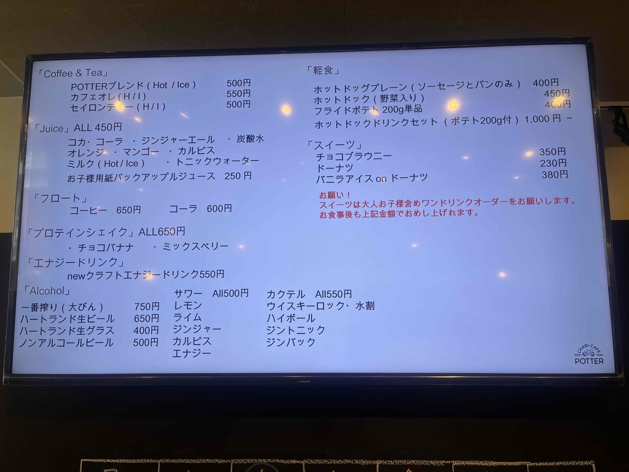 メニュー表は液晶モニターに表示されています!軽食からドリンクまで種類が豊富で楽しめます!またチャリカフェで人気だったドーナツなどもありました。