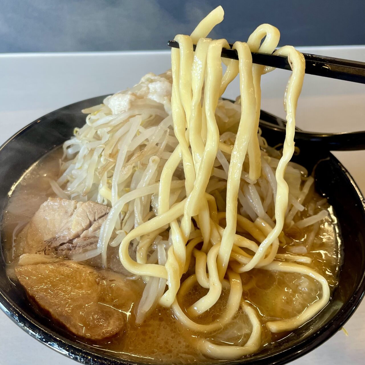 柔らかもやしとキャベツのシャキシャキ感、分厚いチャーシューはジューシーで柔らかく、麺はコシのある平打ち太麵、そしてラーメンの要のスープは濃厚でコクがありながらマイルドな口当たりとすべてのバランスが良い二郎系ラーメンでした。