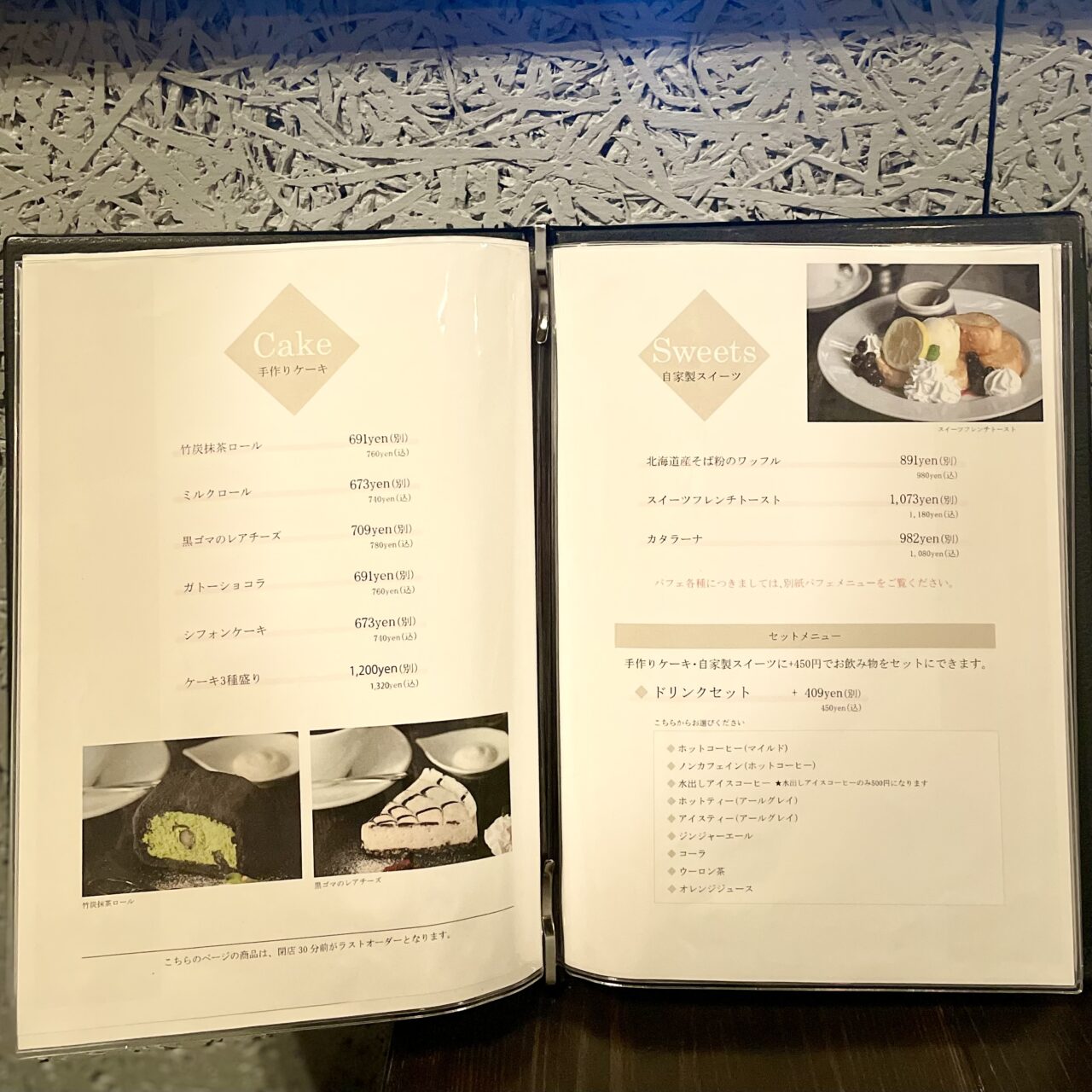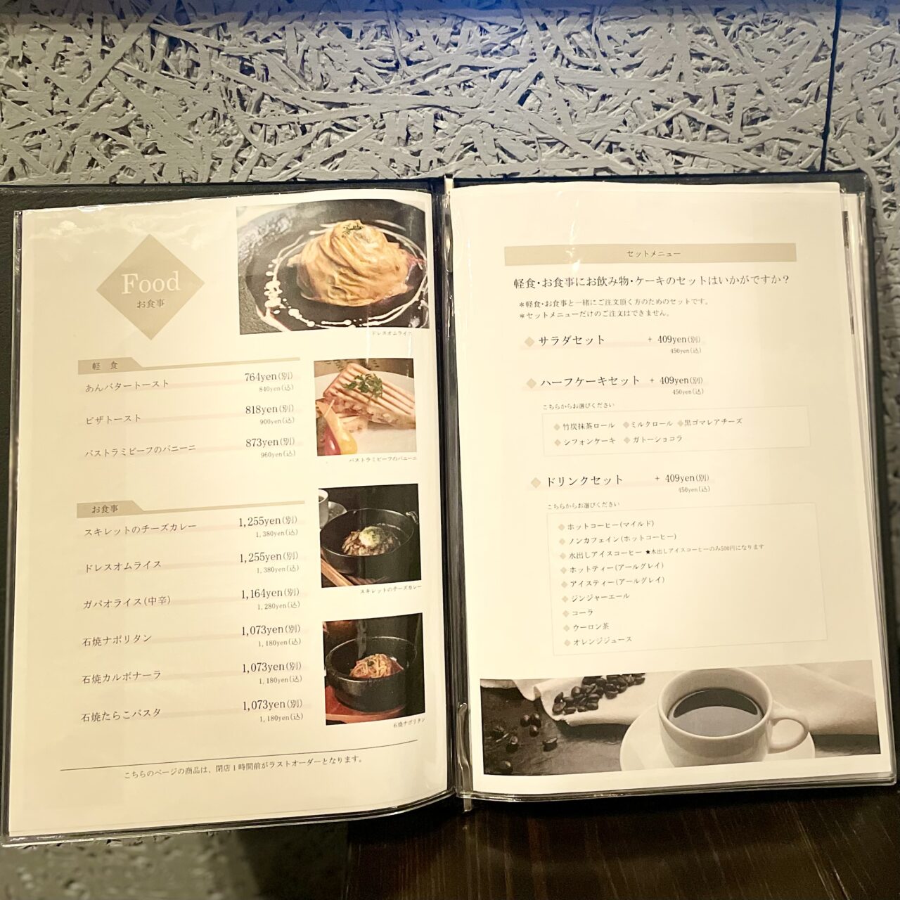 今回はスイーツをいただきましたが、お食事も「パストラミビーフのパニーニ」や「スキレットのチーズカレー」など、とても魅力的なメニューが揃っています。「サラダセット」、「ハーフケーキセット」、「ドリンクセット」などをお食事に追加で注文することができます。