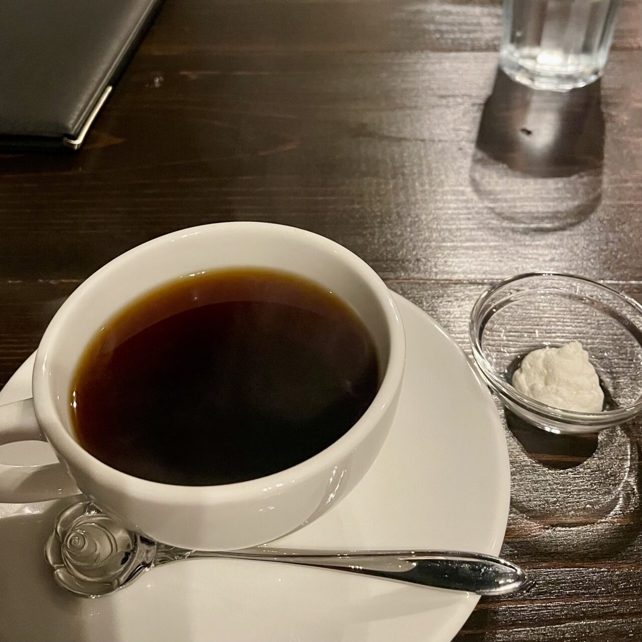 先に珈琲が運ばれてきました。サイフォンで提供される珈琲は、酸味と苦みが控えめで、香り豊かなマイルドで飲みやすい一杯です。別添えでお口直しのホイップクリームがついてくるので、後半まろやかさを追加して楽しむこともできます。