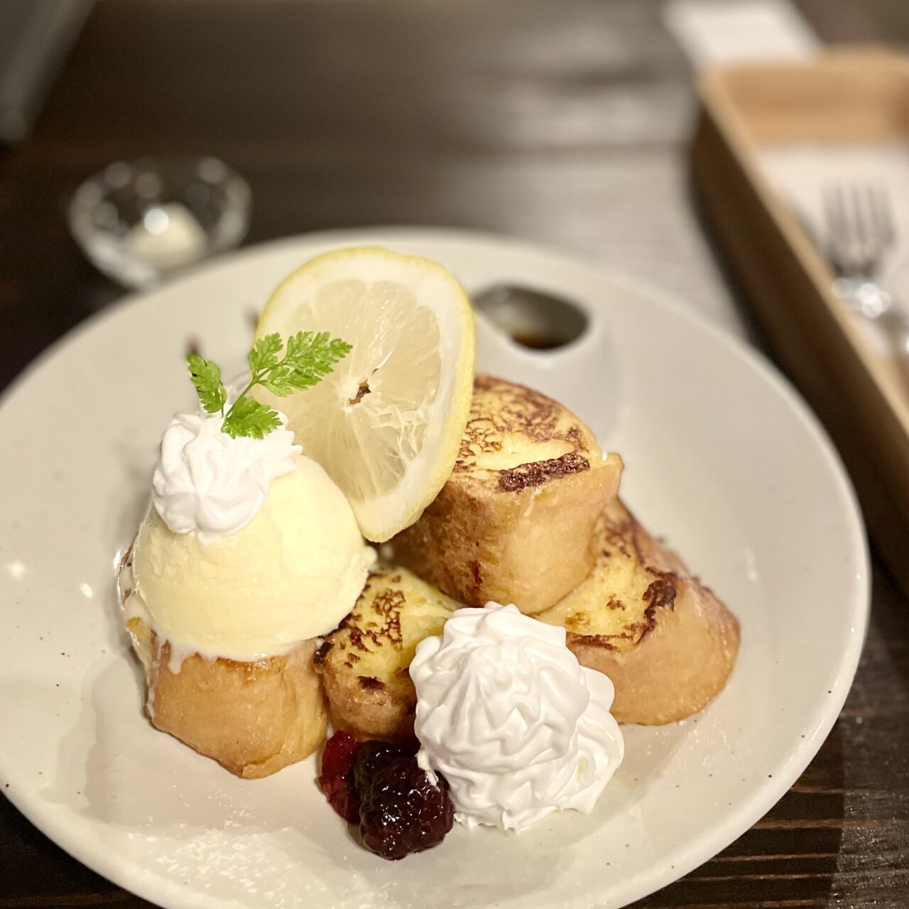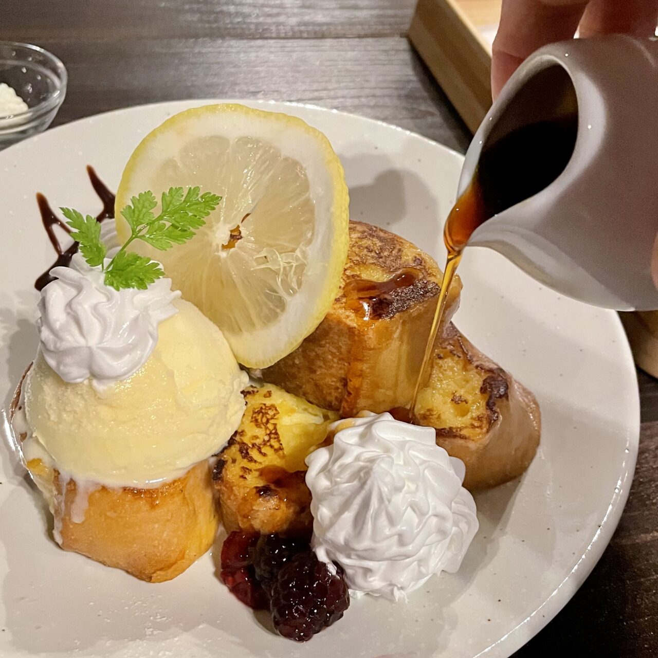お好みでメープルシロップをかけながらいただきます。フレンチトーストは、カリっとフワッのバランスが良く、アイスクリームとホイップクリームを絡ませながらいただく際のバランスを計算された程よい甘さで、とても美味しくいただきました。