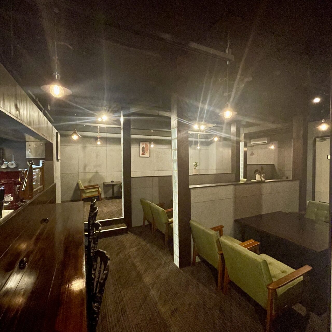 店内はペンダントライトの優しく暖かい照明、シックでゆったりと腰掛けることができる椅子のテーブル席が9卓、カウンター席が5席、それぞれの席幅が余裕を持って配置されているので、落ち着いて過ごすことができるおしゃれな空間になっています。