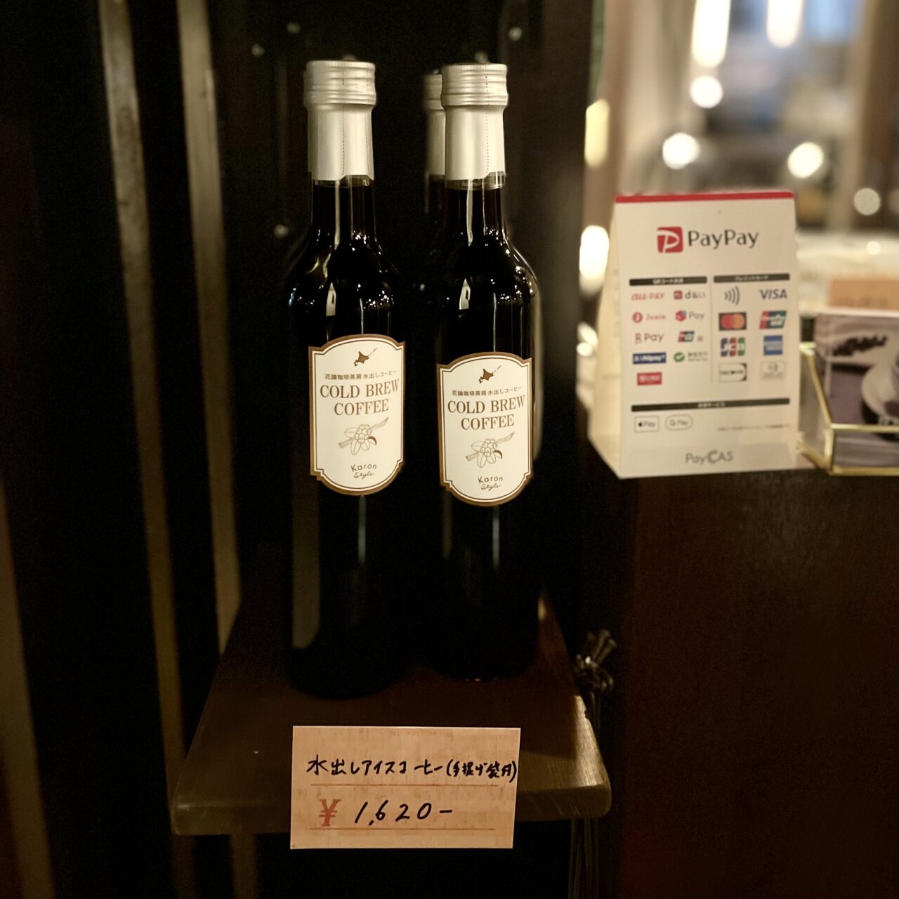 ドリップコーヒーやボトルのアイスコーヒーなどの販売もされています。お支払いは現金以外に各種クレジットカード、QRコード決済などにも対応しています。20時以降のご注文には、夜料金として10パーセント加算されますのでご注意ください。
