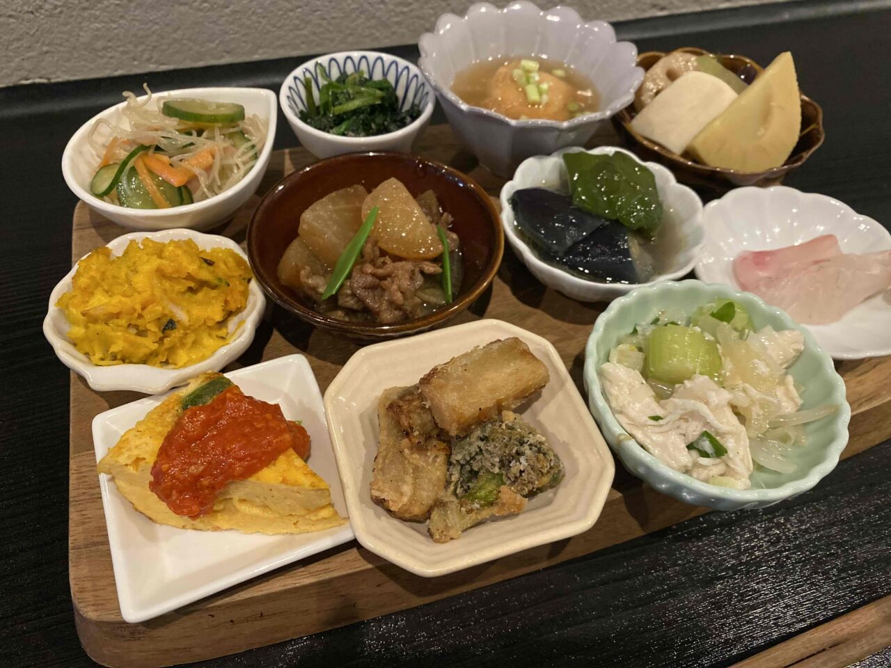 「限定ランチ」のお惣菜盛り合わせ。11種類ものお惣菜が、所狭しと並ぶ様子は圧巻です。牛肉と大根の煮物やオムレツ、かぼちゃのサラダ、青菜のお浸しやお刺身、ゴボウとブロッコリーの揚げ物など、ひとつひとつ丁寧に作られたお惣菜の味はどれも絶品。