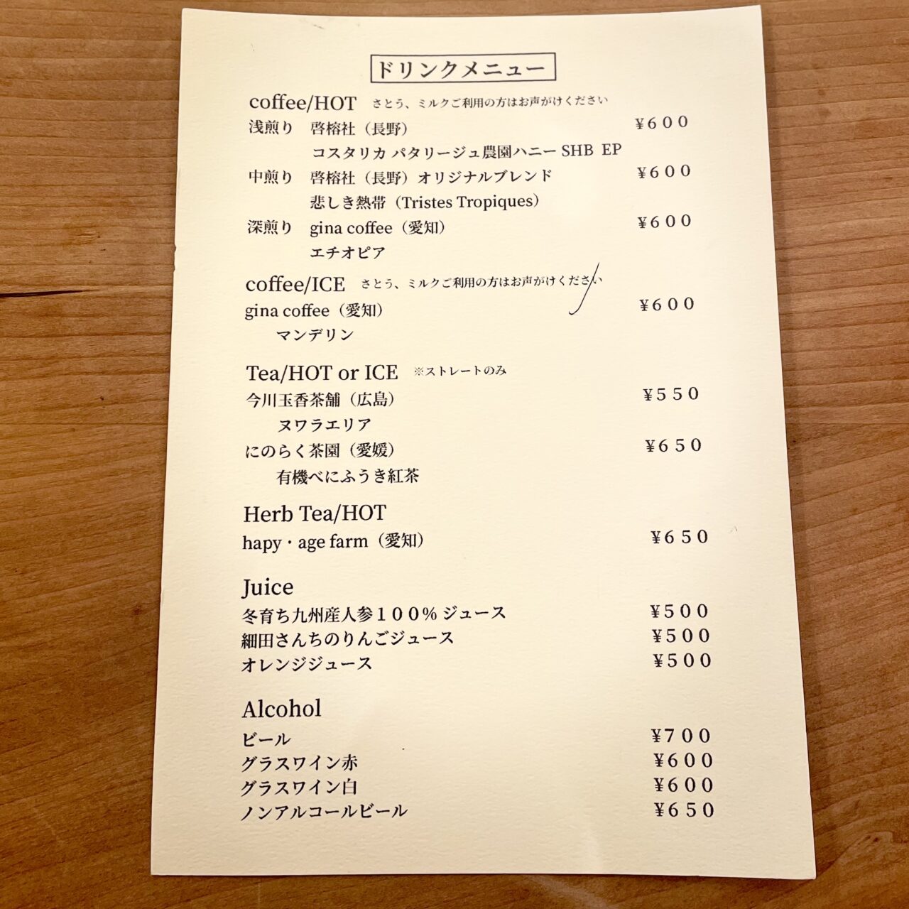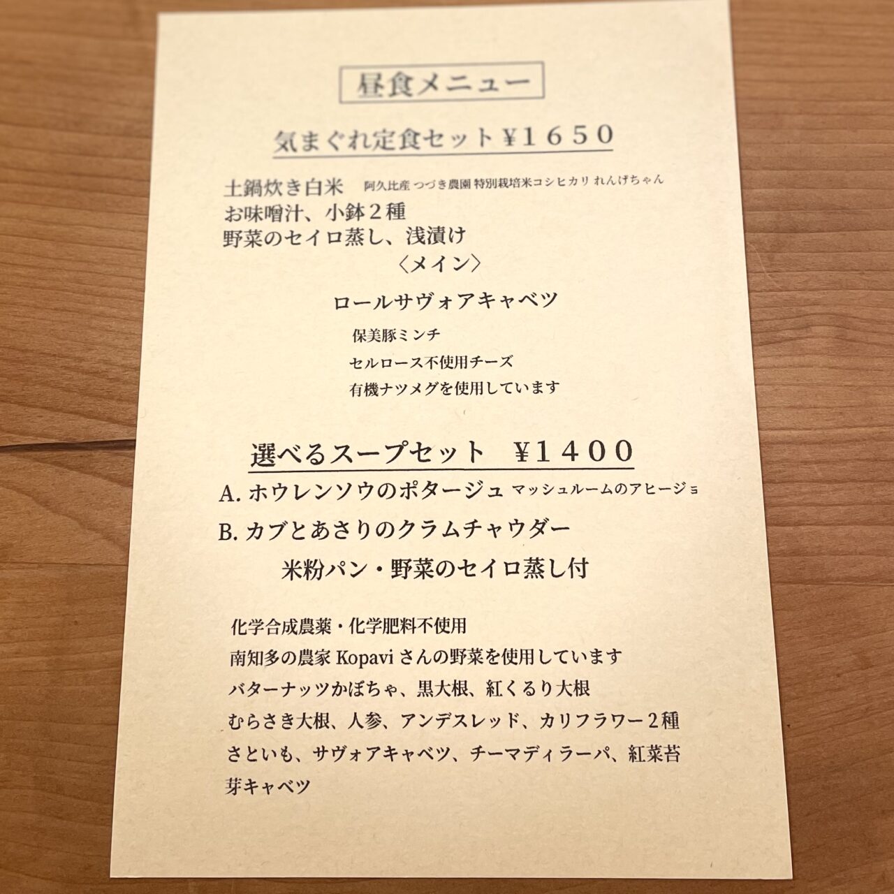 昼食メニューは、「気まぐれ定食セット」と「選べるスープセット」の2種類。スープセットはスープA、Bの2種類から選ぶことができます。使用されている野菜は化学合成農薬・化学肥料不使用、南知多の農家「Kapavi」さんの野菜を使用されています。
