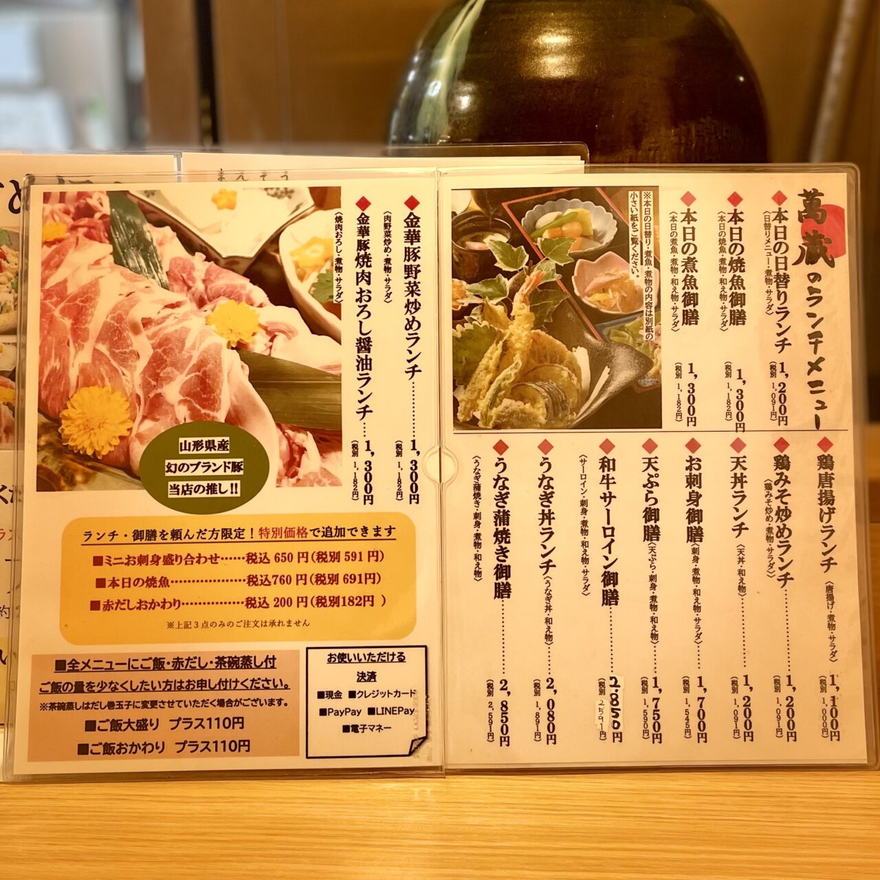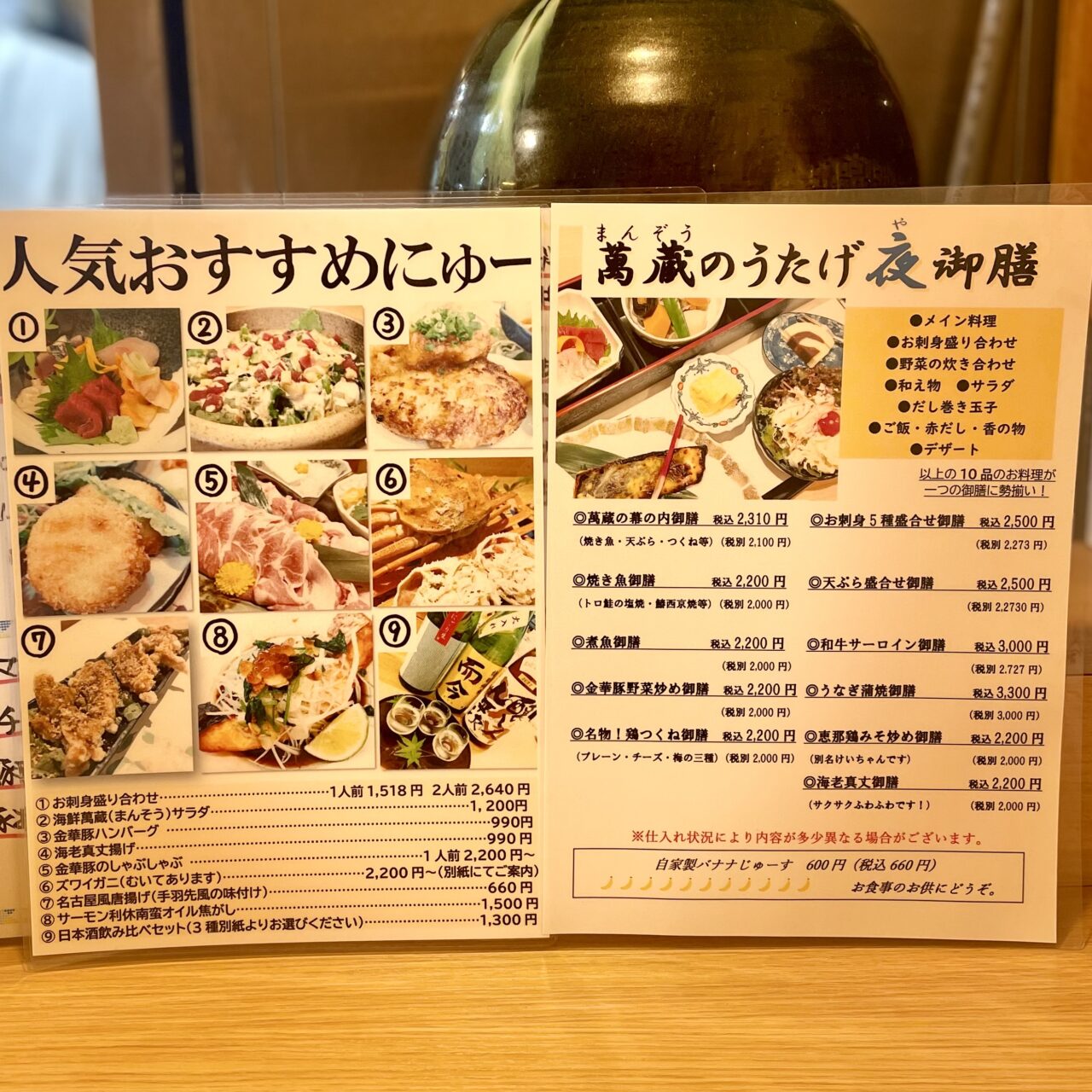 名古屋市名東区、「うたげや 萬蔵」は、メニュー豊富な本格和食ランチを楽しむことができる居酒屋。名古屋市名東区、市営地下鉄東山線藤が丘駅から徒歩1分の場所にある「うたげや 萬蔵」は、本格和食をリーズナブルに気軽に楽しむことができる居酒屋さんです。豊富なメニューのランチは人気で、いつも多くのお客様で賑わっています。名古屋市名東区、「うたげや 萬蔵」は、メニュー豊富な本格和食ランチを楽しむことができる居酒屋。店内は気軽に入りやすいナチュラルな色味の和空間、テーブル席、カウンター席、テーブル席個室があります。名古屋市名東区、「うたげや 萬蔵」は、メニュー豊富な本格和食ランチを楽しむことができる居酒屋。ランチはお魚料理からお肉料理まで、メニューが豊富でリーズナブルです。全メニューにご飯、赤だし、茶碗蒸しがつきます。名古屋市名東区、「うたげや 萬蔵」は、メニュー豊富な本格和食ランチを楽しむことができる居酒屋。ご飯の量を小(約120g)、中(約200g)、大(約280g)から選ぶことができ、おかわりは、各\110で追加注文することができます。名古屋市名東区、「うたげや 萬蔵」は、メニュー豊富な本格和食ランチを楽しむことができる居酒屋。「金華豚ハンバーグ」、「海老真丈揚げ」は人気メニューだそうです。名古屋市名東区、「うたげや 萬蔵」は、メニュー豊富な本格和食ランチを楽しむことができる居酒屋。豊富なメニューから選ぶのに迷いましたが、今回は「本日の焼魚」のB.サワラ西京焼を注文いたしました。名古屋市名東区、「うたげや 萬蔵」は、メニュー豊富な本格和食ランチを楽しむことができる居酒屋。焼魚、ご飯、赤だし、茶碗蒸し、サラダ、きんぴらごぼう、煮物、香の物と豪華なお膳です。名古屋市名東区、「うたげや 萬蔵」は、メニュー豊富な本格和食ランチを楽しむことができる居酒屋。メインの焼魚は、身は柔らかく皮がパリパリ、ご飯がすすむ美味しさでした。煮物や茶碗蒸しなども本当に美味しくて、これだけ豪華なお膳で\1,300とは、本当にリーズナブルです。名古屋市名東区、「うたげや 萬蔵」は、メニュー豊富な本格和食ランチを楽しむことができる居酒屋。ランチメニューにはランチ会席コースもあり、予約なしで注文できます。名古屋市名東区、「うたげや 萬蔵」は、メニュー豊富な本格和食ランチを楽しむことができる居酒屋。日本酒は大将が全国の酒造から厳選されているそうです。伺った日もランチと共に昼飲みを楽しまれているお客様もいらっしゃいました。名古屋市名東区、「うたげや 萬蔵」は、メニュー豊富な本格和食ランチを楽しむことができる居酒屋。お忙しい中取材へのご協力をいただきまして、ありがとうございました。リーズナブルにメニュー豊富な本格和食ランチを楽しむことができる「うたげや 萬蔵」に是非一度足をお運びください。