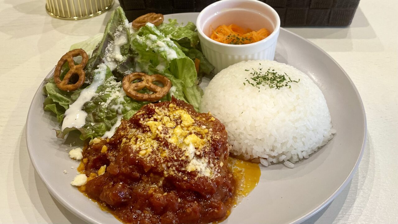 見た目も鮮やかなプレートはボリューム満点です。メインのハンバーグは、トマトソースとデミグラスソースをミックスしたオリジナルソース、トマトの酸味と風味が感じられ、弾力感のあるジューシーなハンバーグでした。