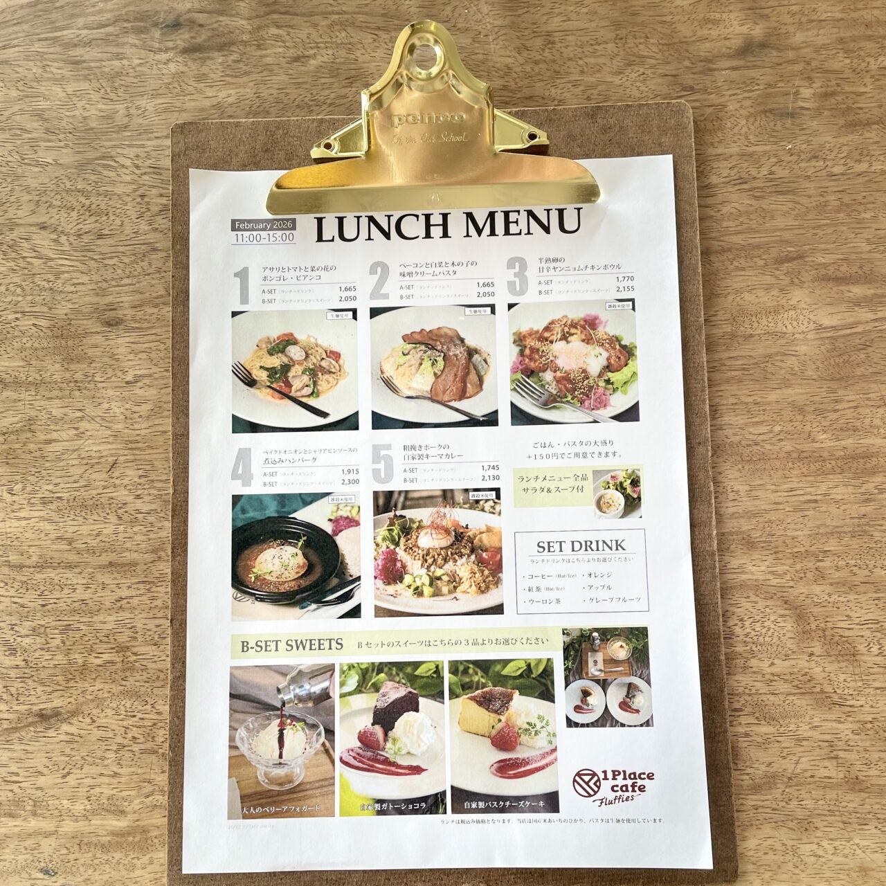 ランチメニューは5種類、ランチ全品にサラダとスープがつきます。Aセットはランチ+ドリンク、Bセットはランチ+ドリンク+スイーツのセットになります。今回はランチ2の「ベーコンと白菜と木の子の味噌クリームパスタ」をBセットで注文いたしました。