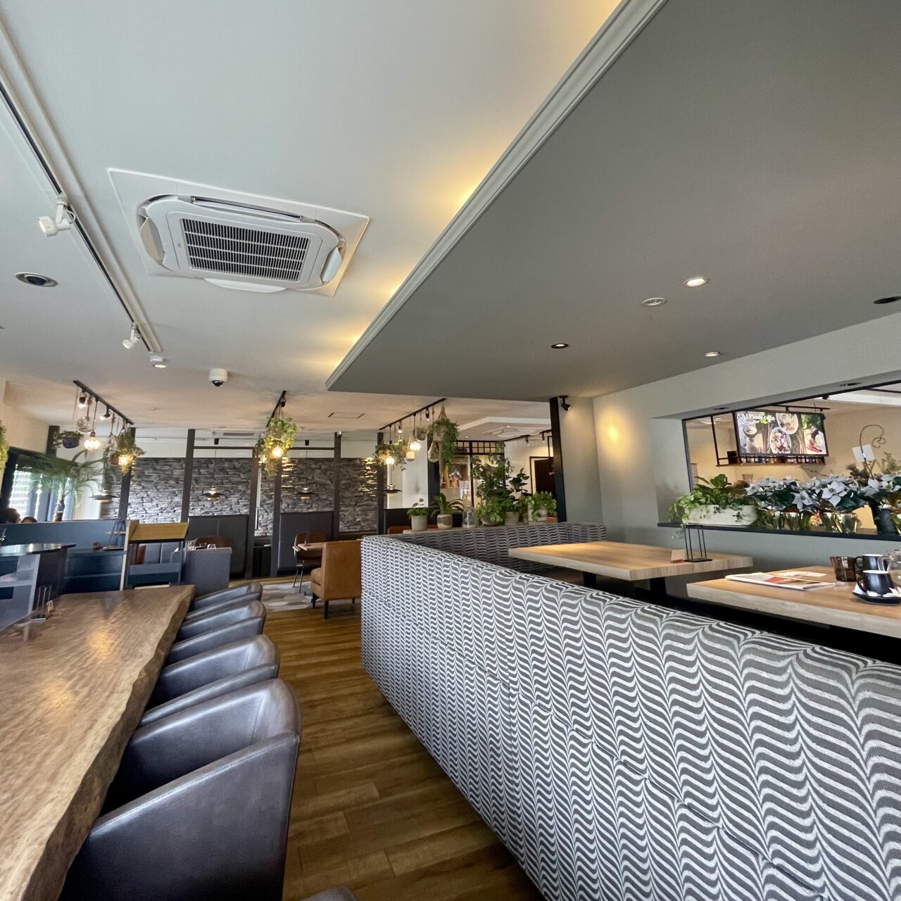 店内はテーブル席とカウンター席の全67席。ゆったりとくつろげる、開放的でおしゃれな空間です。