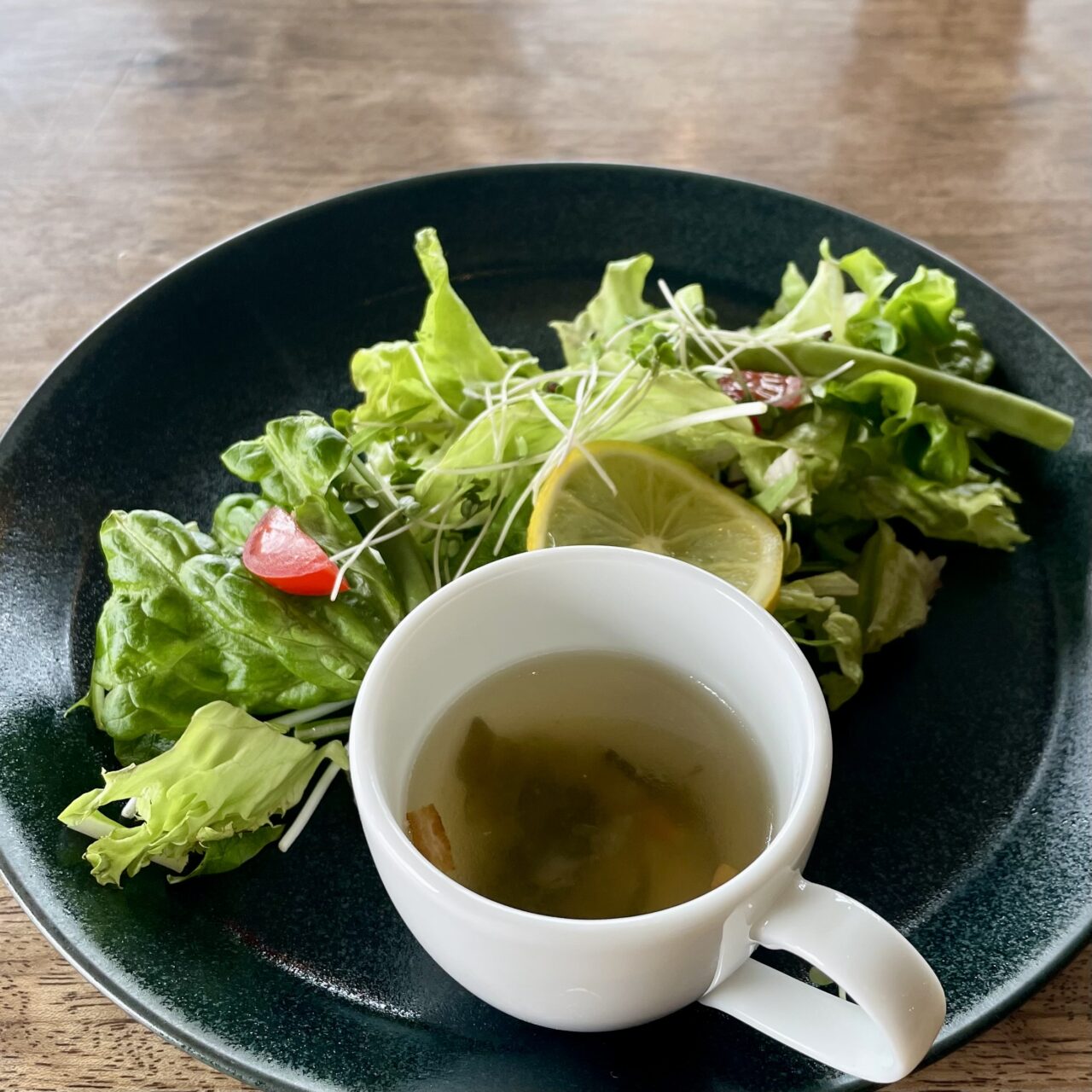 ランチ全品にセットでつくミニカップサイズのコンソメスープに、レタス、水菜、ミニトマト、かいわれ大根、スナップエンドウなどの瑞々しいイタリアンサラダ。