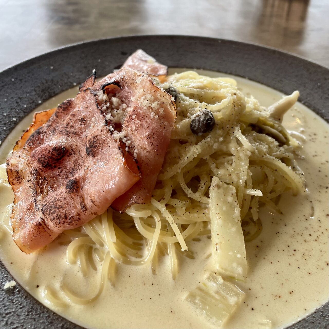 メインの「ベーコンと白菜と木の子の味噌クリームパスタ」は細麺の生パスタにお味噌の風味をバランスよく感じるクリームソースを絡ませていただきます。大ぶりのベーコンと木の子、白菜など具材がトッピングされたボリューム感のあるパスタです。