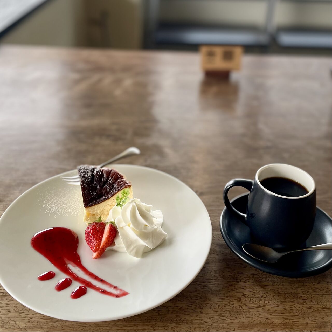 食後のスイーツは、「自家製バスクチーズケーキ」とこだわりのコーヒー、甘さのバランスが程よいしっとり、ふわっと口の中で広がるチーズケーキと柔らかな甘みと穏やかな苦みのバランスがとれたコーヒーとの相性は抜群です。
